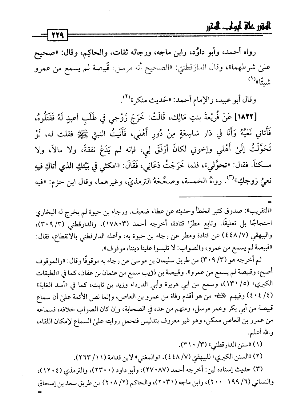 [1832] عَنْ فُريْعةَ بنتِ مَالِك، قَالَتْ: خَرَجَ زَوْجي في طَلَبِ أعبدٍ لَهُ فَقَتَلُوهُ، فَأَتاني نَعْيُهُ وَأَنا في دَار شاسِعَةٍ مِنْ دُورِ أَهْلِي، فَأتَيتُ النبيَّ -صلى اللَّه عليه وسلم- فقلت له، لَوْ تَحَوَّلْتُ إلَى أَهْلي وإخوتي لكانَ أرْفَقَ لِي، فإنه لم يَدَعْ نفقةً، ولا مالا، ولا مسكنًا. فقال: "تحوَّلي"، فلما خَرَجَتُ دَعَانِي، فَقَالَ: "امكثي في بَيْتكِ الذي أتاكِ فيهِ نعيُ زوجكِ" (¬3). رواهُ الخمسة، وصحَّحَهُ الترمذيّ، وغيرهما، وقال ابن حزم: "فيه