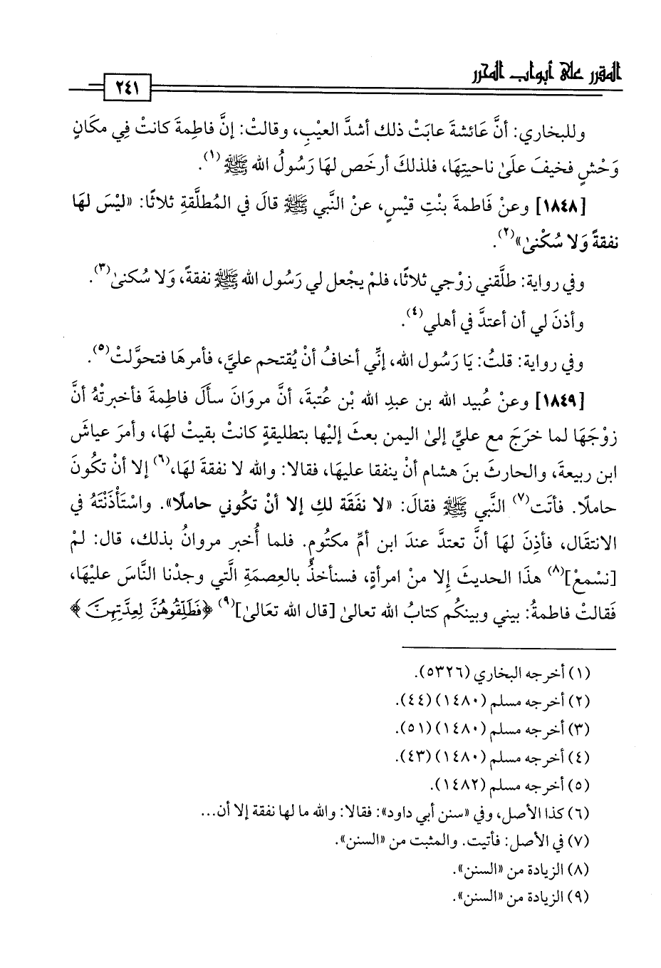 [1848] وعنْ فَاطمةَ بنْتِ قيْسٍ، عنْ النَّبي -صلى اللَّه عليه وسلم- قَالَ في المُطلَّقةِ ثلاثًا: "ليْسَ لهَا نفقةً وَلَا سُكْنى" (¬2).