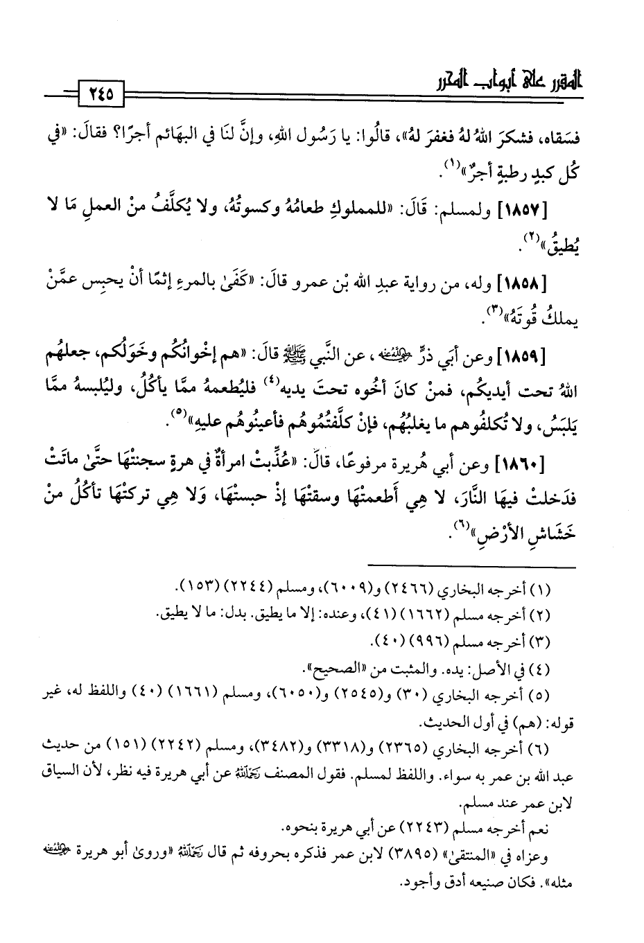 [1857] ولمسلم: قَالَ: "للمملوكِ طعامُهُ وكسوتُهُ، ولا يُكلَّفُ منْ العملِ مَا لا يُطيقُ" (¬2).