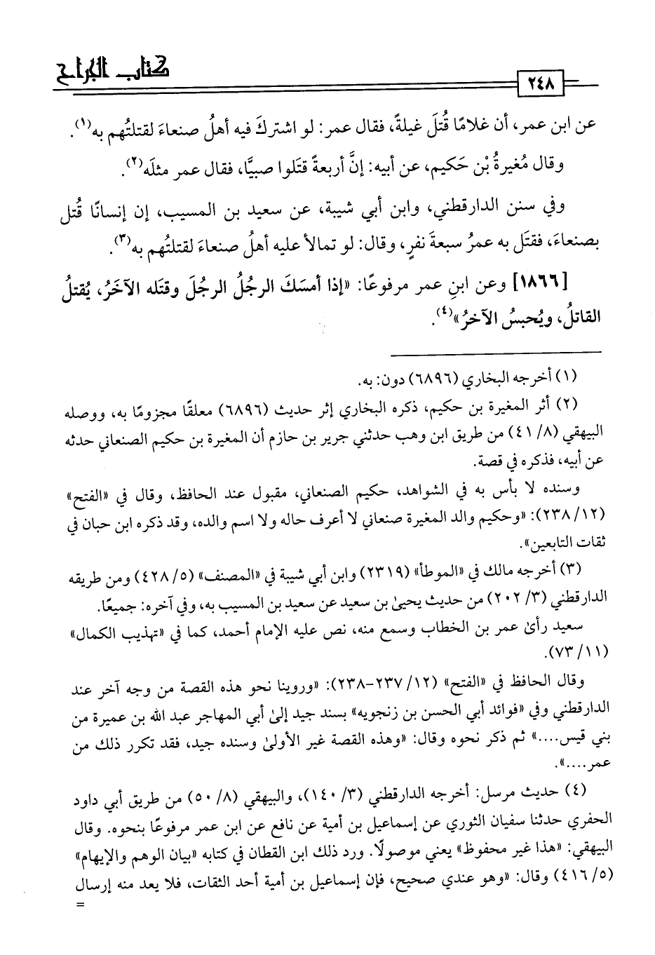 [1866] وعن ابنِ عمر مرفوعًا: "إذا أمسَكَ الرجُلُ الرجُلَ وقتَله الآخَرُ، يُقتلُ القاتلُ، ويُحبسُ الآخرُ" (¬4).