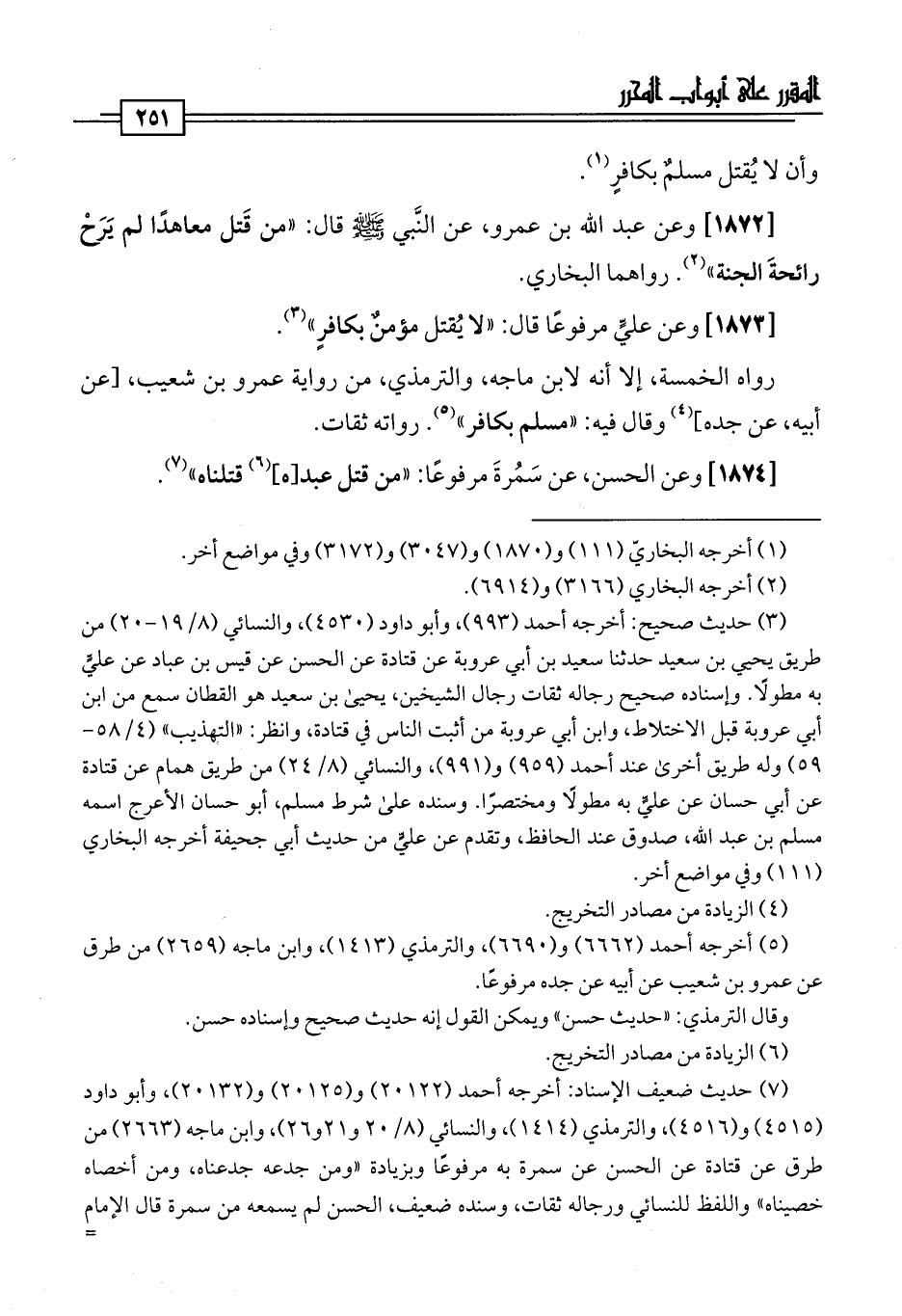 [1873] وعن عليٍّ مرفوعًا قال: "لا يُقتل مؤمنٌ بكافرٍ" (¬3).