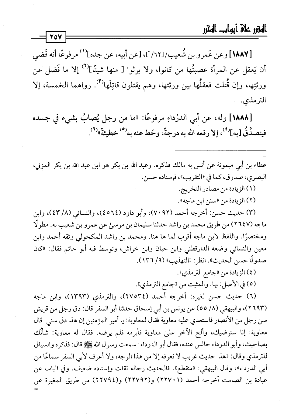 (¬6) حديث حسن لغيره: أخرجه أحمد (27534)، والترمذي (1393)، وابن ماجه (2693)، والبيهقي (8/ 55) عن يونس بن أبي إسحاق حدثنا أبو السفر قال: دق رجل من قريش سن رجل من الأنصار فاستعدي عليه معاوية فقال لمعاوية: يا أمير المؤمنين إن هذا دق سنين. قال معاوية: إنا سنرضيك، وألح الآخر على معاوية فأبرمه فلم يرضه. فقال له معاوية: شأنُك بصاحبك، وأبو الدرداء جالس عنده، فقال أبو الدرداء: سمعت رسول اللَّه -صلى اللَّه عليه وسلم- قال: فذكره والسياق للترمذي وقال: "هذا حديث غريب لا نعرفه إلا من هذا الوجه، ولا أعرف لأبي السفر سماعًا من أبي الدرداء"، وقال البيهقي: "منقطع". فالحديث رجاله ثقات وإسناده ضعيف. وفي الباب عن عبادة بن الصامت أخرجه أحمد (22701) و (22792) و (22794) من طريق المغيرة عن =