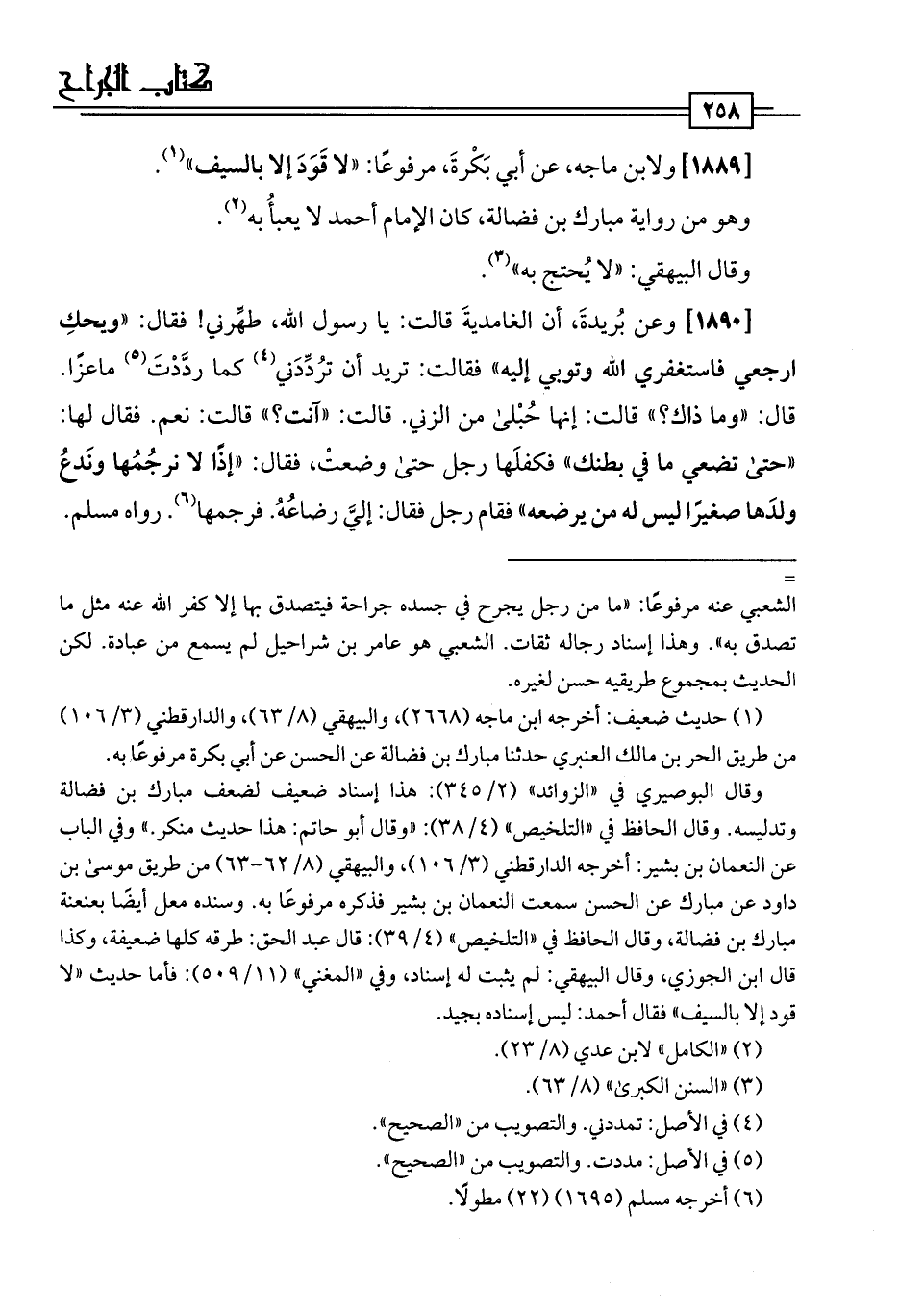 [1889] ولابن ماجه، عن أبي بَكْرةَ، مرفوعًا: "لا قَوَدَ إلا بالسيف" (¬1).