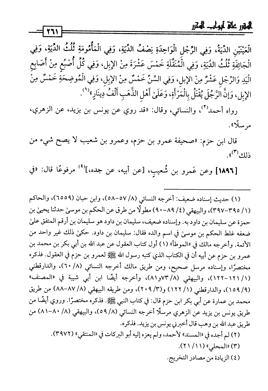 (¬1) حديث إسناده ضعيف: أخرجه النسائي (8/ 57 - 58)، وابن حبان (6559)، والحاكم (1/ 395 - 397)، والبيهقي (4/ 89 - 90) مطولًا من طرق عن الحكم بن موسى حدثنا يحيى بن حمزة عن سليمان بن داود به. وإسناده ضعيف، سليمان بن داود هو سليمان بن أرقم المتفق على ضعفه غلط الحكم بن موسى في اسم والده فقال: سليمان بن داود. حكى ذلك غير واحد من الأئمة. وأخرجه مالك في "الموطأ" (1) أول كتاب العقول عن عبد اللَّه بن أبي بكر بن محمد بن عمرو بن حزم عن أبيه أن في الكتاب الذي كتبه رسول اللَّه -صلى اللَّه عليه وسلم- لعمرو بن حزم في العقول. فذكره مختصرًا، وإسناده مرسل صحيح، ومن طريق مالك أخرجه النسائي (8/ 60)، والدارقطني (1/ 121 - 122)، والبيهقي (8/ 73 و 81)، وأخرجه أيضًا ابن أبي شيبة في "المصنف" (9/ 159)، والدارقطني (1/ 122) و (3/ 209)، ومن طريقه البيهقي (8/ 87 - 88) من طريق محمد بن عمارة عن أبي بكر ابن حزم قال: في كتاب النبي -صلى اللَّه عليه وسلم-. فذكره مختصرًا. وروي أيضًا من طريق يونس بن يزيد عن الزهري مرسلًا أخرجه النسائي (8/ 59)، والبيهقي (8/ 80 - 81) من طريق عبد اللَّه بن وهب قال أخبرني يونس بن يزيد. فذكره.