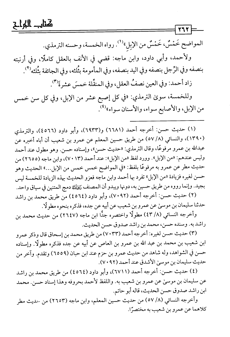(¬1) حديث حسن: أخرجه أحمد (6681) و (6933)، وأبو داود (4566)، والترمذي (1390)، والنسائي (8/ 57) من طريق حسين المعلم عن عمرو بن شعيب أن أباه أخبره عن عبد اللَّه بن عمرو مرفوعًا، وقال الترمذي: "حديث حسن"، وإسناده حسن. وهو مطول عند أحمد وليس عندهم: "من الإبل". وورد لفظ "من الإبل": عند أحمد (7013)، وابن ماجه (2655) من حديث مطر عن عمرو به مرفوعًا بلفظ: "في المواضع خمس خمس من الإبل. . . " الحديث وهو حسن لغيره فزيادة "من الإبل" تفرد بها أحمد وابن ماجه فعزو الحديث بهذه الزيادة للخمسة ليس بجيد. وإنما رووه من طريق حسين به، دونها ويبدو أن المصنف رحمه اللَّه دمج المتنين في سياق واحد.