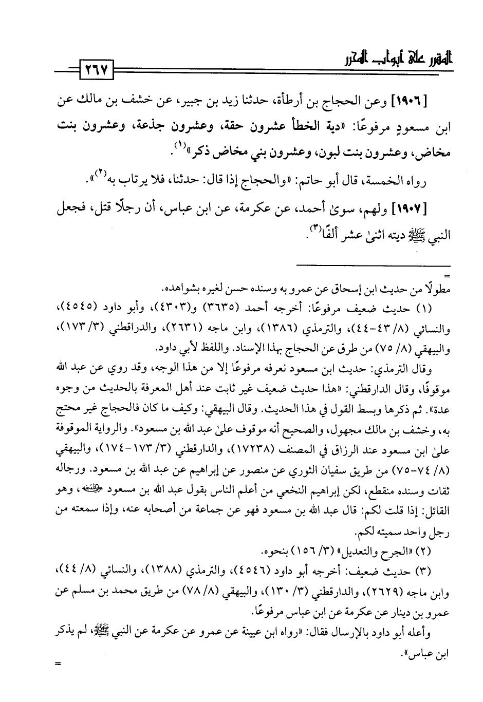 [1906] وعن الحجاج بن أرطأة، حدثنا زيد بن جبير، عن خشف بن مالك عن ابن مسعودٍ مرفوعًا: "دية الخطأ عشرون حقة، وعشرون جذعة، وعشرون بنت مخاض، وعشرون بنت لبون، وعشرون بني مخاض ذكر" (¬1).