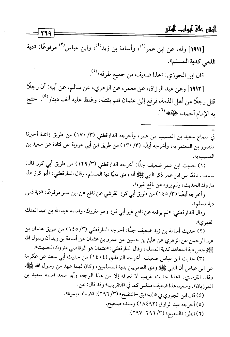 (¬2) حديث أسامة بن زيد ضعيف جدًّا: أخرجه الدارقطني (3/ 145) من طريق عثمان بن عبد الرحمن عن الزهري عن علي بن حسين عن عمرو بن عثمان عن أسامة بن زيد أن رسول اللَّه -صلى اللَّه عليه وسلم- جعل دية المعاهد كدية المسلم، وقال الدارقطني: "عثمان هو الوقاصي متروك الحديث".