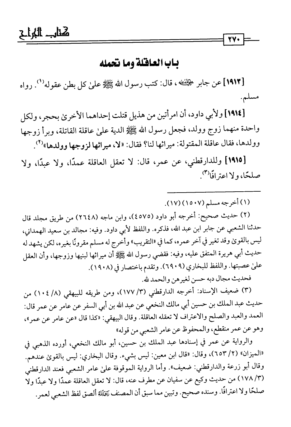 [1913] عن جابر -رضي اللَّه عنه-، قال: كتب رسول اللَّه -صلى اللَّه عليه وسلم- على كل بطن عقوله (¬1). رواه مسلم.