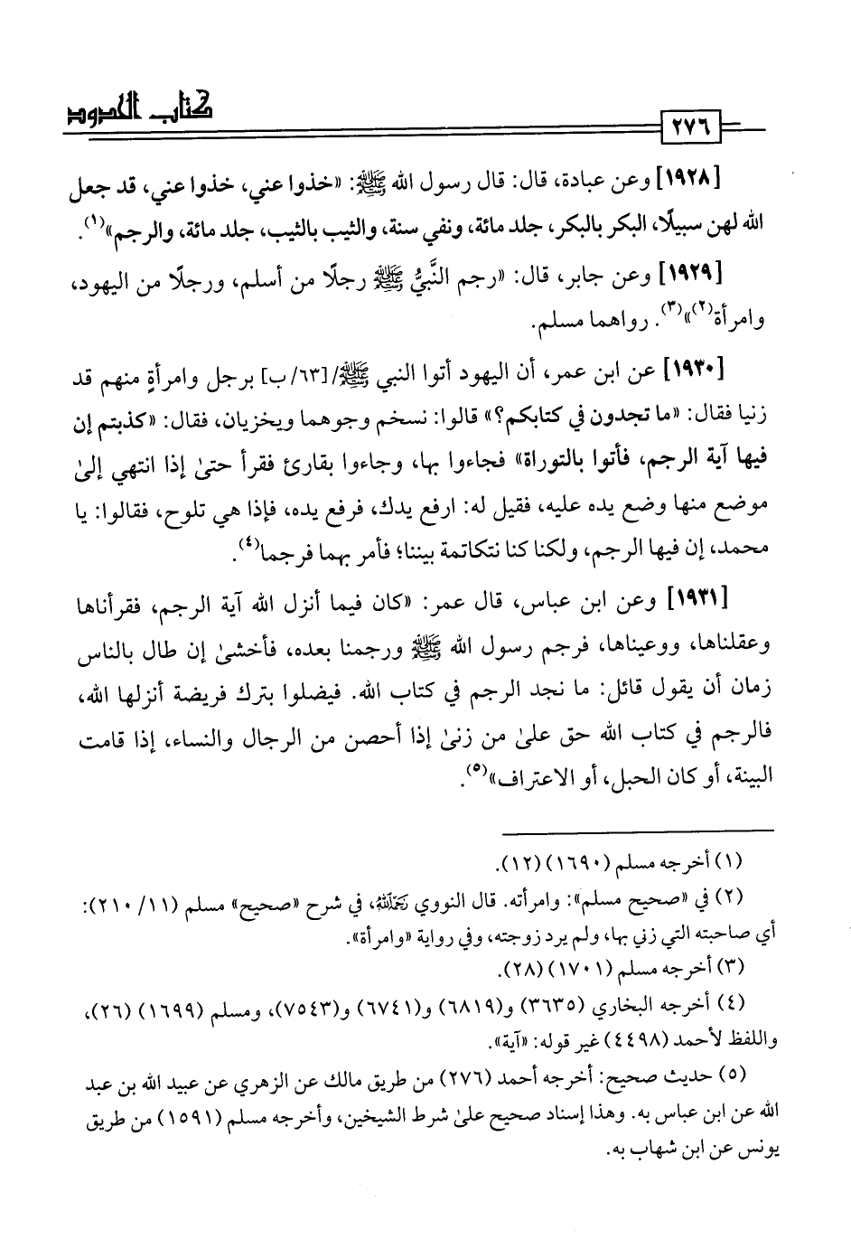 [1930] عن ابن عمر، أن اليهود أتوا النبي -صلى اللَّه عليه وسلم- برجل وامرأةٍ منهم قد زنيا فقال: "ما تجدون في كتابكم؟ " قالوا: نسخم وجوهما ويخزيان، فقال: "كذبتم إن فيها آية الرجم، فأتوا بالتوراة" فجاءوا بها، وجاءوا بقارئ فقرأ حتى إذا انتهي إلى موضع منها وضع يده عليه، فقيل له: ارفع يدك، فرفع يده، فإذا هي تلوح، فقالوا: يا محمد، إن فيها الرجم، ولكنا كنا نتكاتمه بيننا؛ فأمر بهما فرجما (¬4).