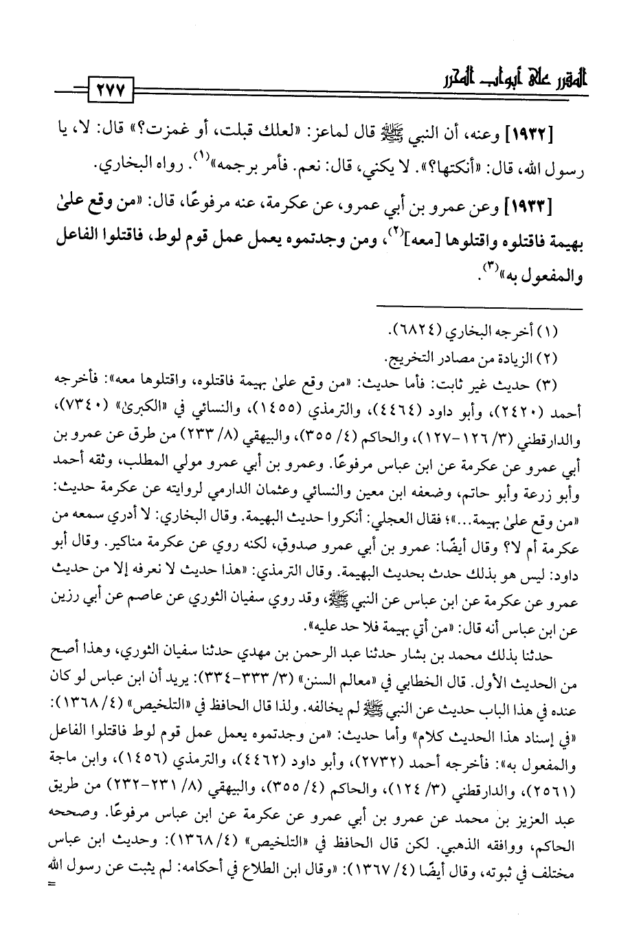 [1933] وعن عمرو بن أبي عمرو، عن عكرمة، عنه مرفوعًا، قال: "من وقع على بهيمة فاقتلوه واقتلوها [معه] (¬2)، ومن وجدتموه يعمل عمل قوم لوط، فاقتلوا الفاعل والمفعول به" (¬3).