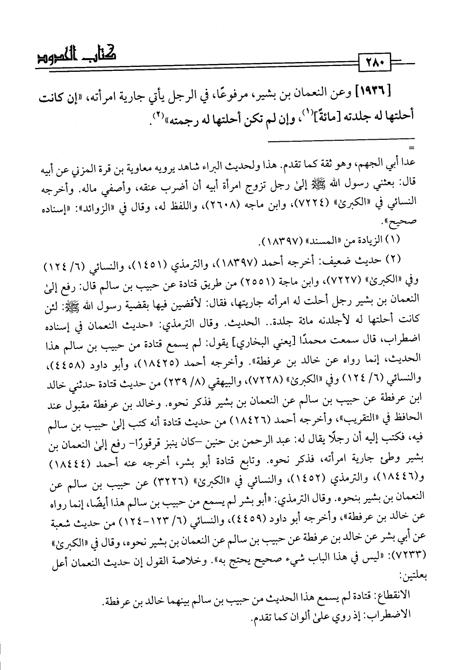 [1936] وعن النعمان بن بشير، مرفوعًا، في الرجل يأتي جارية امرأته، "إن كانت أحلتها له جلدته [مائةً] (¬1)، وإن لم تكن أحلتها له رجمته" (¬2).