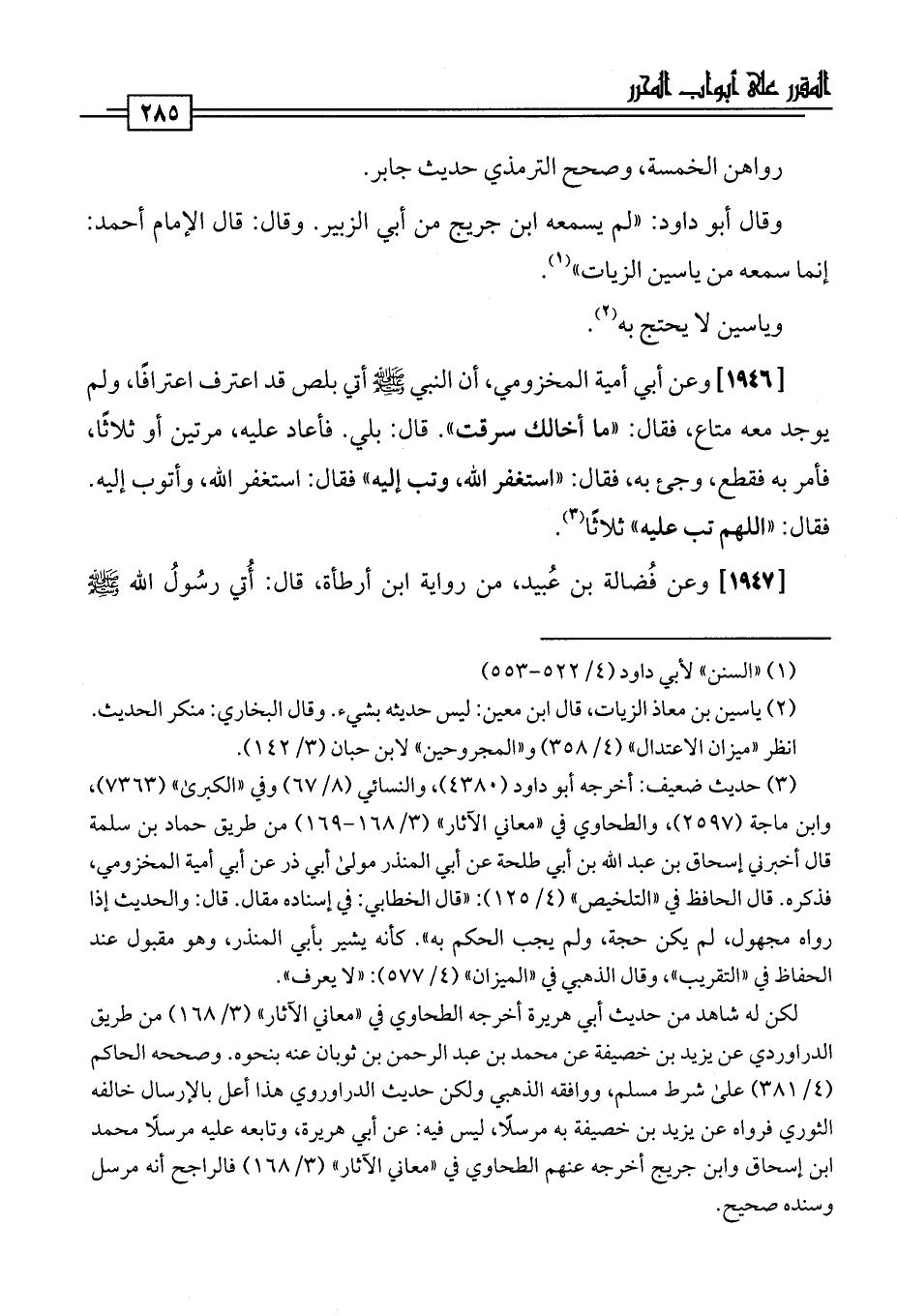 [1946] وعن أبي أمية المخزومي، أن النبي -صلى اللَّه عليه وسلم- أتي بلص قد اعترف اعترافًا، ولم يوجد معه متاع، فقال: "ما أخالك سرقت". قال: بلي. فأعاد عليه، مرتين أو ثلاثًا، فأمر به فقطع، وجئ به، فقال: "استغفر اللَّه، وتب إليه" فقال: استغفر اللَّه، وأتوب إليه. فقال: "اللهم تب عليه" ثلاثًا (¬3).