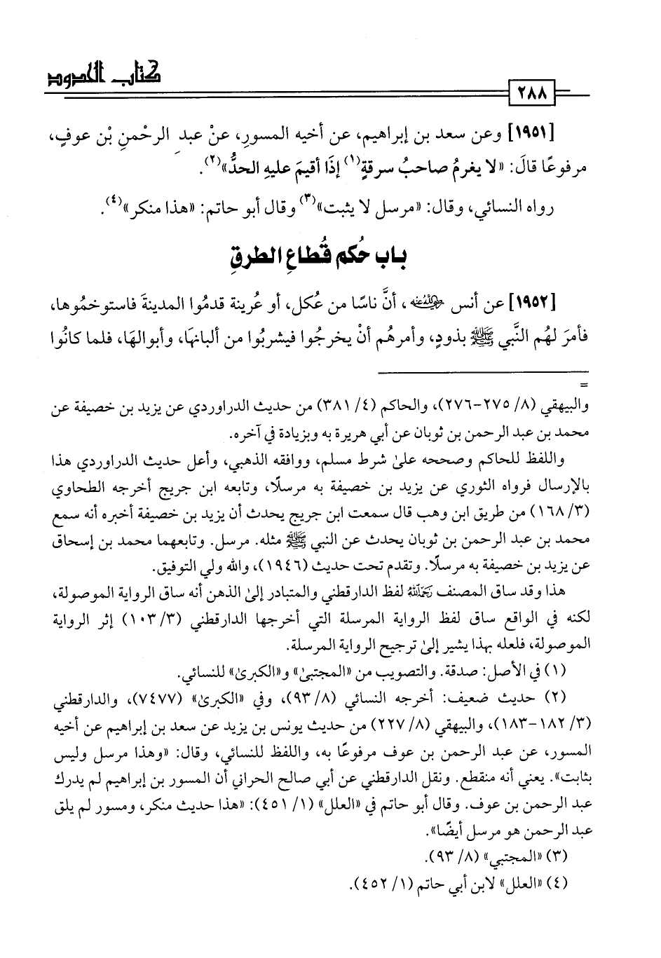 [1951] وعن سعد بن إبراهيم، عن أخيه المسورِ، عنْ عبد الرحْمنِ بن عوفٍ، مرفوعًا قَالَ: "لا يغرمُ صاحبُ سرقةٍ (¬1) إذَا أقيمَ عليهِ الحدُّ" (¬2).