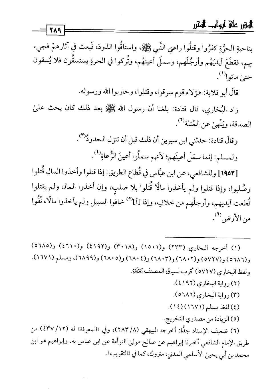 [1953] وللشافعي، عن ابن عبَّاس في قُطاع الطريق: إذا قتلوا وأخذوا المال قُتلوا وصُلبوا، وإذا قتلوا ولم يأخذوا مالًا قُتلوا بلا صلبٍ، وإن أخذوا المال ولم يقتلوا قُطعت أيديهم، وأرجلُهم من خلافٍ، وإذا [أ] (¬5) خافوا السبيل ولم يأخذوا مالًا، نُفُوا من الأرض (¬6).