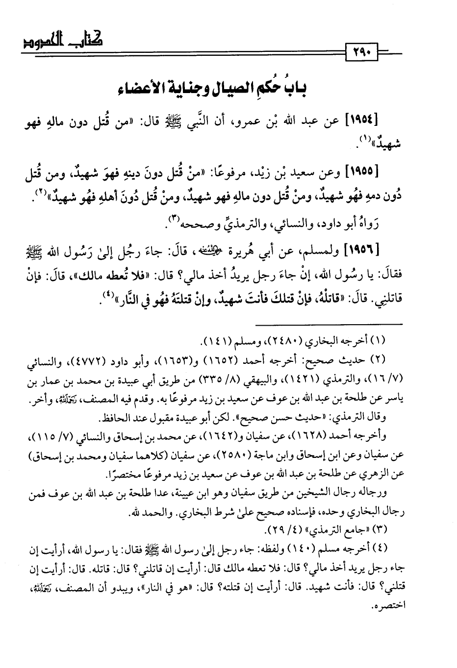 [1954] عن عبد اللَّه بن عمرو، أن النَّبي -صلى اللَّه عليه وسلم- قال: "من قُتل دون مالهِ فهو شهيدٌ" (¬1).