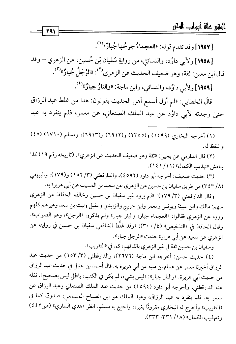 وقال الدارقطني (3/ 179): "لم يروه غير سفيان بن حسين وخالفه الحفاظ عن الزهري منهم: مالك وابن عيينة ويونس ومعمر وابن جريج والزبيدي وعقيل وليث بن سعد وغيرهم كلهم رووه عن الزهري فقالوا: "العجماء جبار، والبئر جبار" ولم يذكروا "الرجل"، وهو الصواب". وقال الحافظ في "التلخيص" (4/ 300): "وقد غلَّط الشافعي سفيان بن حسين في روايته عن الزهري عن سعيد عن أبي هريرة حديث "الرجل جبار".