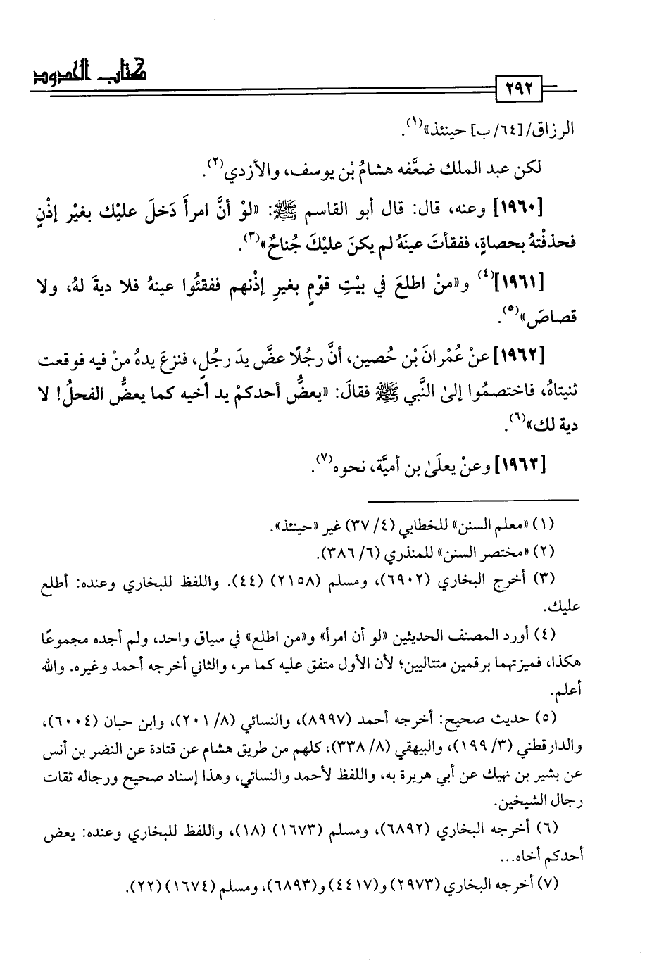 [1960] وعنه، قال: قال أبو القاسم -صلى اللَّه عليه وسلم-: "لوْ أنَّ امرأَ دَخلَ عليْك بغيْر إذْنٍ فحذفْتهُ بحصاةٍ، ففقأتَ عينَهُ لم يكن عليْكَ جُناحٌ" (¬3).