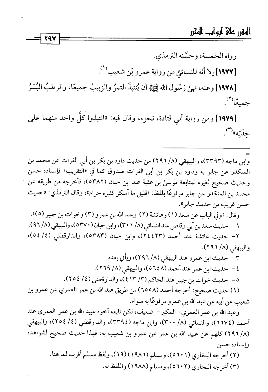 [1978] وعنه، نهى رَسُول اللَّه -صلى اللَّه عليه وسلم- أن يُنتبذَ التمرُ والزبيبُ جميعًا، والرطبُ البُسْرُ جميعًا (¬2).