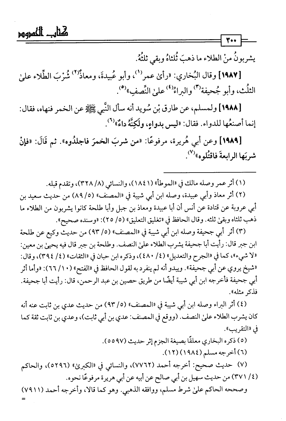 [1987] وقال البُخاري: "رأى عمر (¬1)، وأبو عُبيدةَ، ومعاذٌ (¬2) شُرْبَ الطِّلاء على الثلُث، وأبو جُحيفة (¬3) والبراءُ (¬4) على النِّصفِ" (¬5).