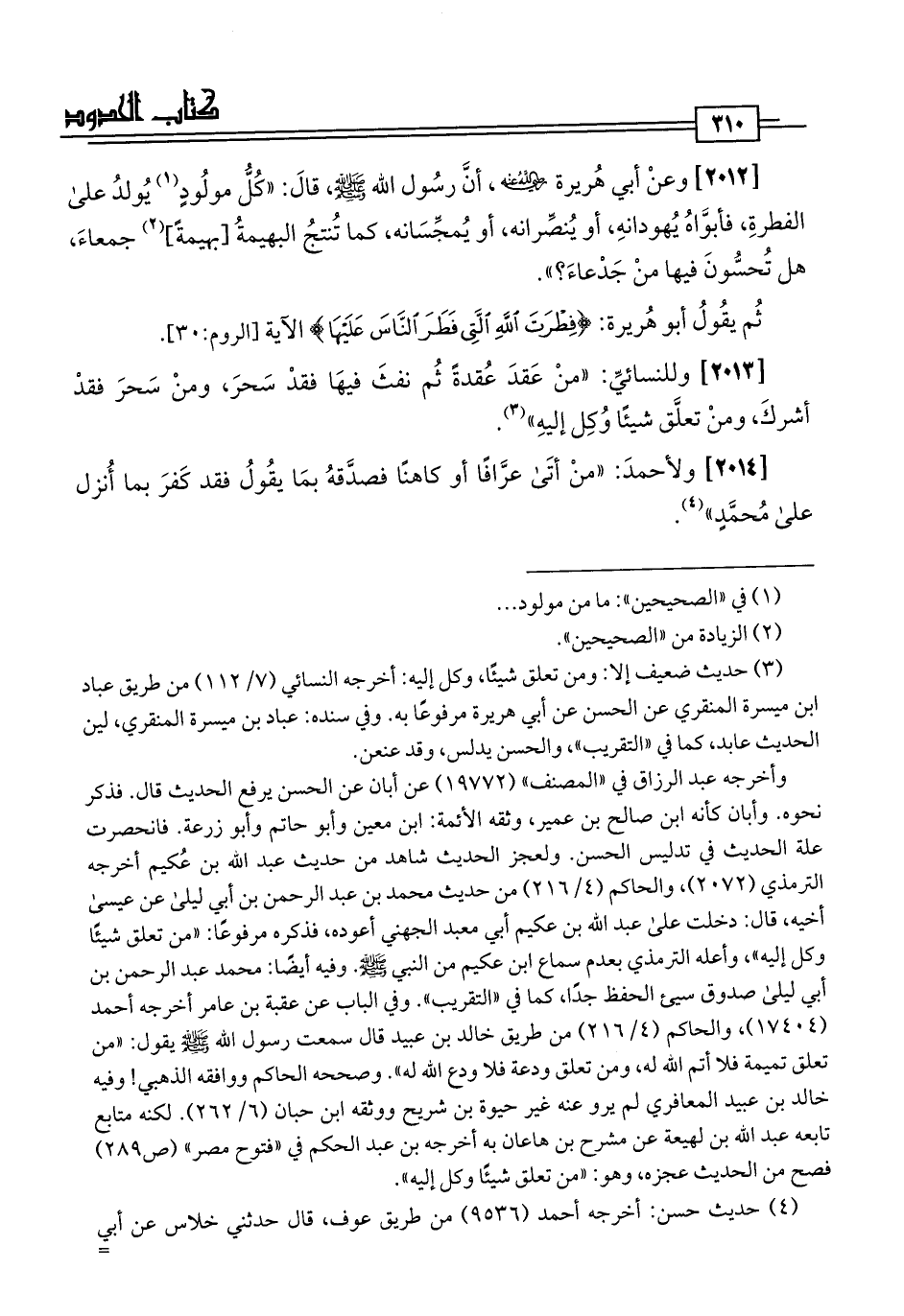 [2014] ولأحمدَ: "منْ أتَى عرَّافًا أو كاهنًا فصدَّقهُ بمَا يَقُولُ فقد كَفرَ بما أُنزل على مُحمَّدٍ" (¬4).