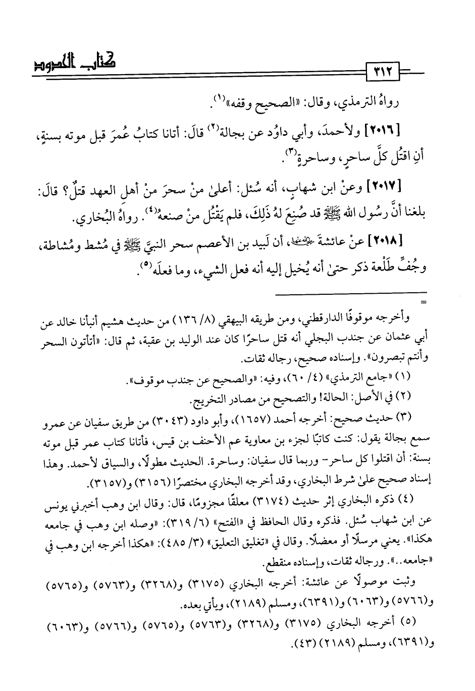(¬3) حديث صحيح: أخرجه أحمد (1657)، وأبو داود (3043) من طريق سفيان عن عمرو سمع بجالة يقول: كنت كاتبًا لجزء بن معاوية عم الأحنف بن قيس، فأتانا كتاب عمر قبل موته بسنة: أن اقتلوا كل ساحر -وربما قال سفيان: وساحرة. الحديث مطولًا، والسياق لأحمد. وهذا إسناد صحيح على شرط البخاري، وقد أخرجه البخاري مختصرًا (3156) و (3157).