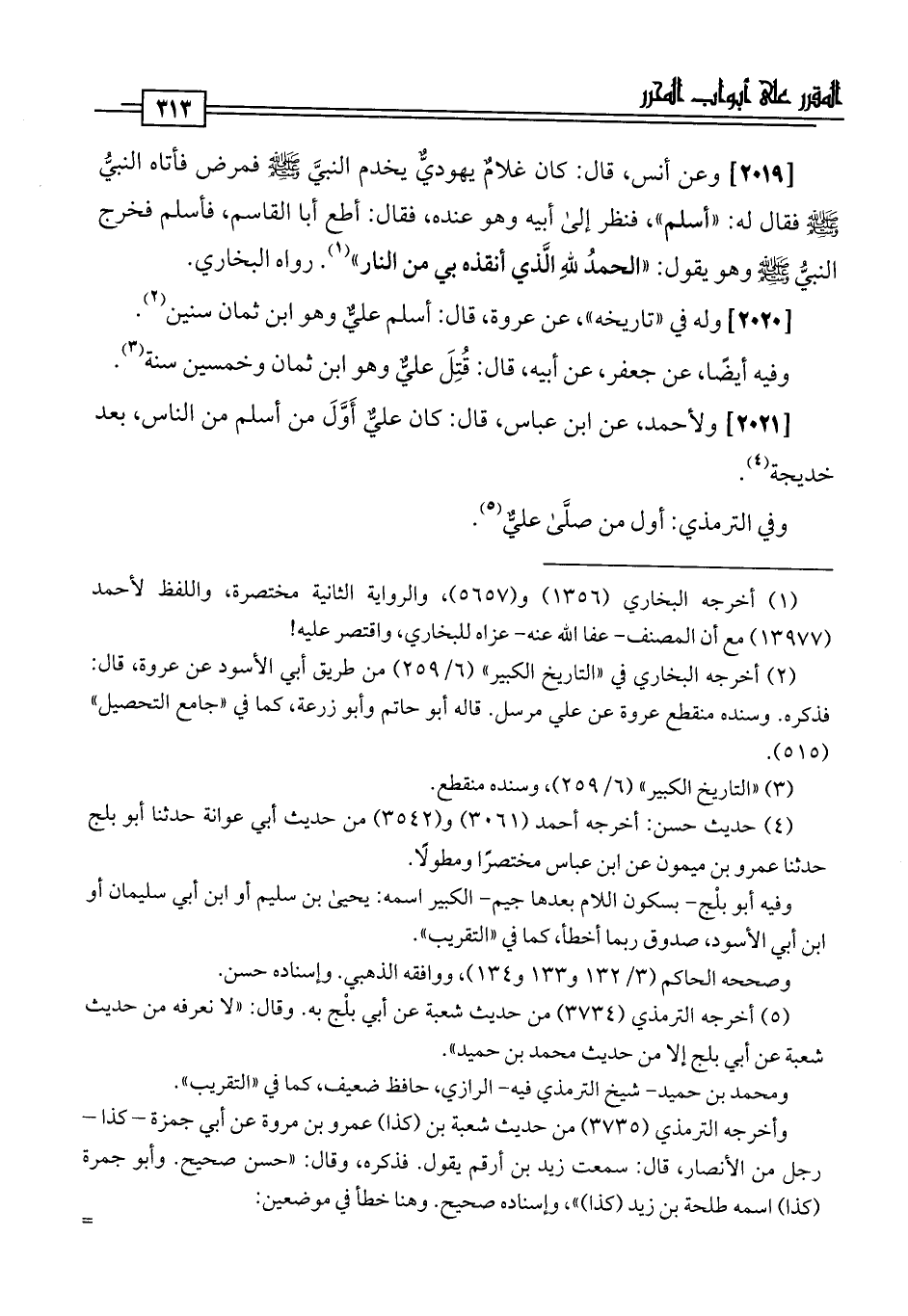 [2021] ولأحمد، عن ابن عباس، قال: كان عليٌّ أَوَّلَ من أسلم من الناس، بعد خديجة (¬4).