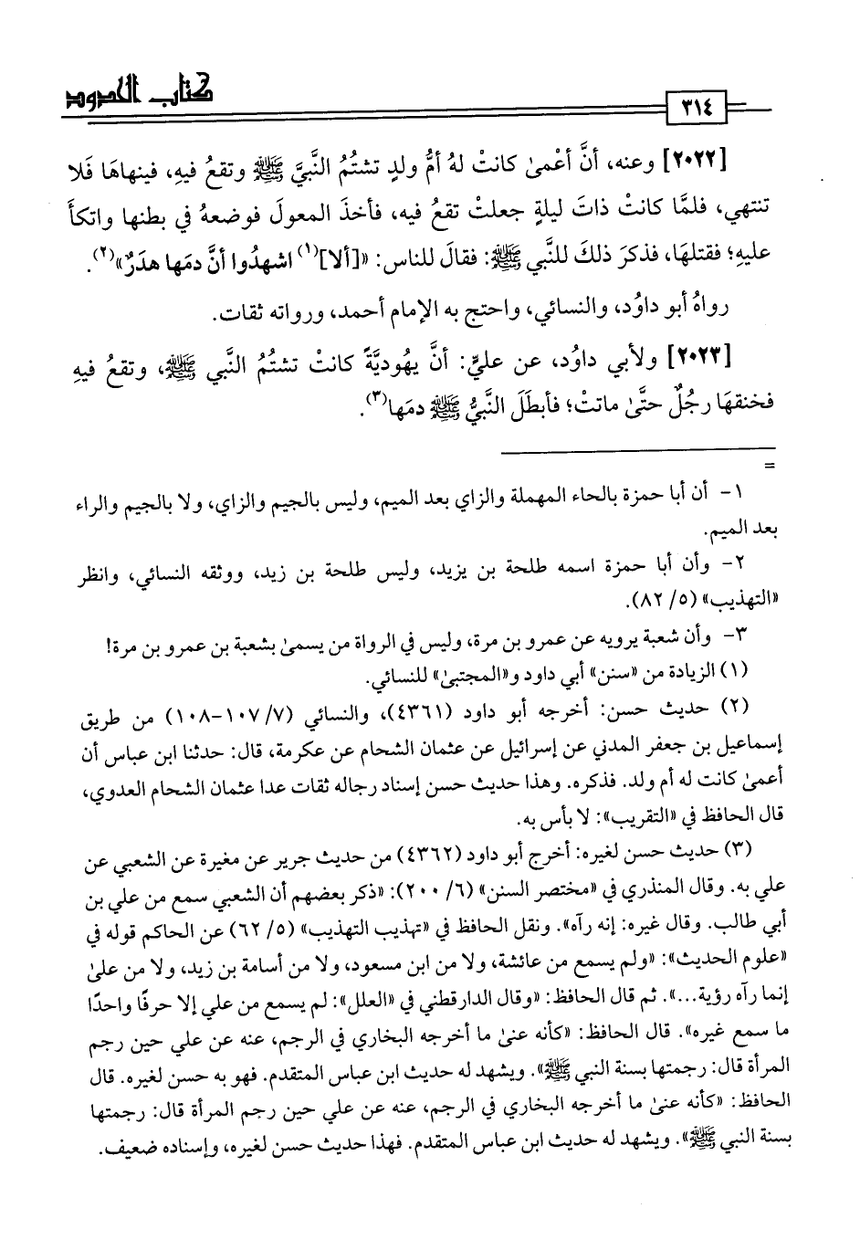 [2023] ولأبي داوُد، عن عليٍّ: أنَّ يهُوديّةً كانتْ تشتُمُ النَّبي -صلى اللَّه عليه وسلم-، وتقعُ فيهِ فخنقهَا رجُلٌ حتَّى ماتتْ؛ فأبطَلَ النَّبيُّ -صلى اللَّه عليه وسلم- دمَها (¬3).
