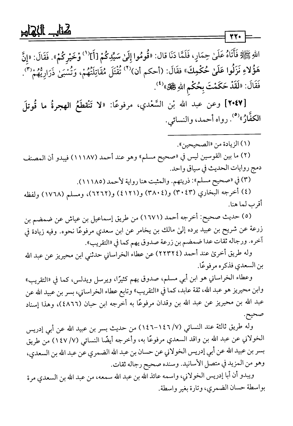 [2047] وعن عبد اللَّه بن السَّعْدي، مرفوعًا: "لا تَنْقطَعُ الهجرةُ ما قُوتلَ الكفَّارُ" (¬5). رواه أحمد، والنسائي.