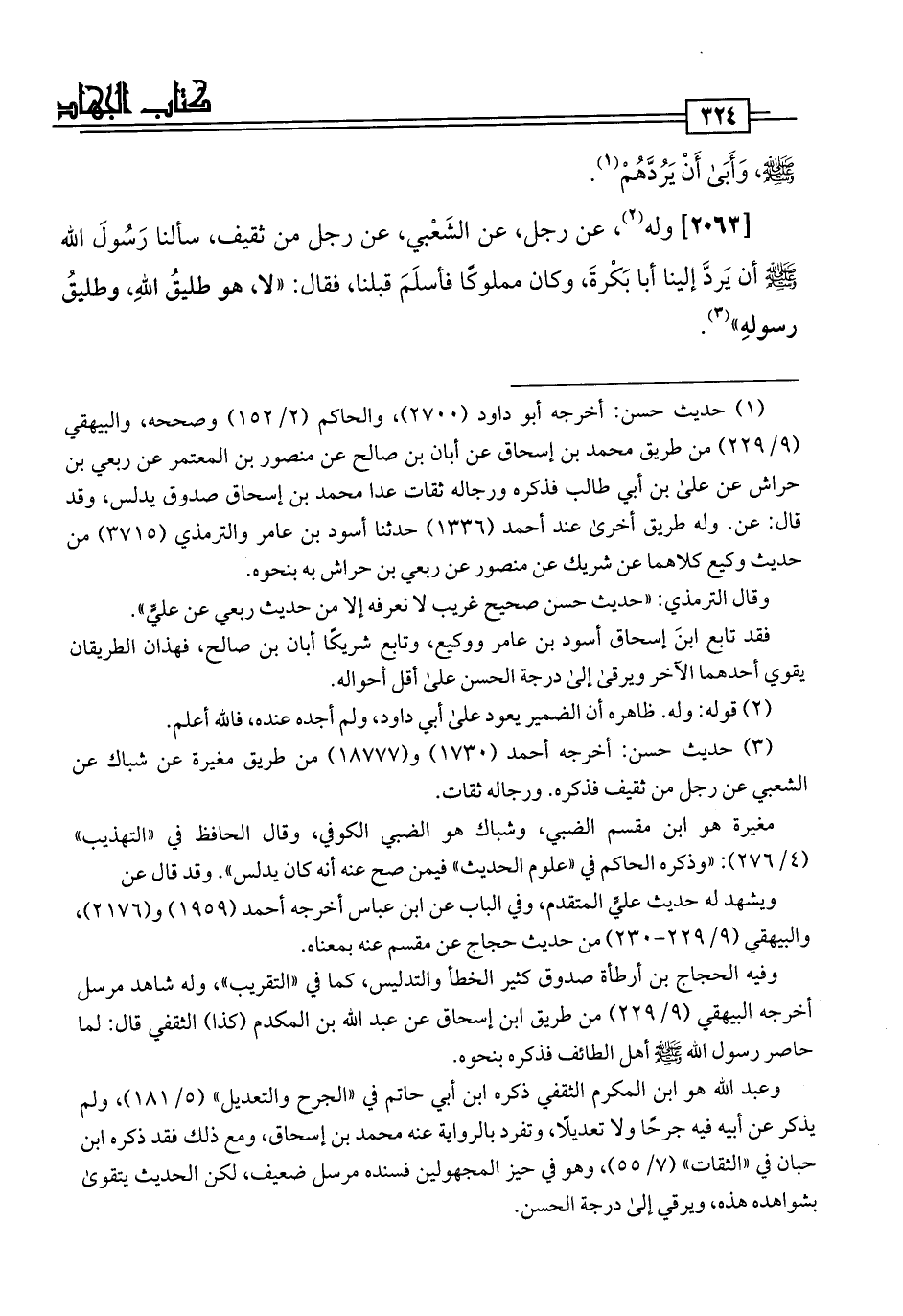 [2063] وله (¬2)، عن رجل، عن الشَعْبي، عن رجل من ثقيف، سألنا رَسُولَ اللَّه -صلى اللَّه عليه وسلم- أن يَردَّ إلينا أبا بَكْرةَ، وكان مملوكًا فأسلَمَ قبلنا، فقال: "لا، هو طليقُ اللَّهِ، وطليقُ رسولهِ" (¬3).