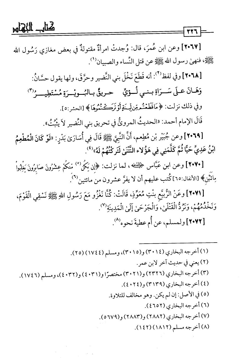 [2067] وعن ابن عُمرَ، قال: وُجدتْ امرأةٌ مقتولةٌ في بعض مغازي رَسُول اللَّه -صلى اللَّه عليه وسلم-، فنهى رسول اللَّه -صلى اللَّه عليه وسلم- عن قتل النِّساء والصبيان (¬1).