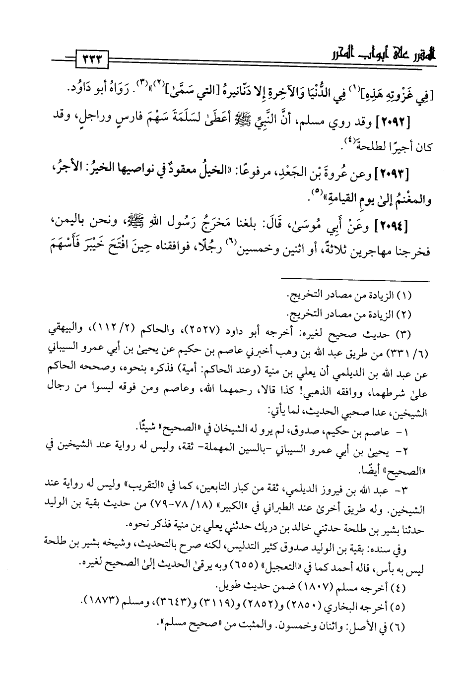 [2093] وعن عُروةَ بن الجَعْدِ، مرفوعًا: "الخيلُ معقودٌ في نواصيها الخيرُ: الأجرُ، والمغْنمُ إلى يومِ القيامةِ" (¬5).