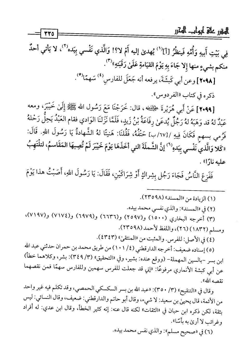 (¬5) إسناده ضعيف: أخرجه الدارقطني (4/ 101) من طريق محمد بن حمران حدثني عبد اللَّه ابن بسر -بالسين المهملة- (ووقع عنده: بشير، وفي "التحقيق" (3/ 349): بشر، وكلاهما خطأ) عن أبي كبشة الأنماري مرفوعًا: "إني قد جعلت للفرس سهمين وللفارس سهمًا فمن نقصهما نقصه اللَّه".