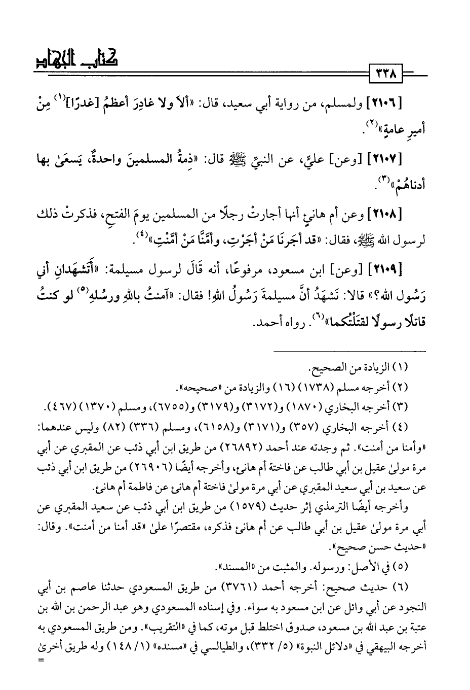 [2107] [وعن] عليٍّ، عن النبيِّ -صلى اللَّه عليه وسلم- قال: "ذِمةُ المسلمينَ واحدةٌ، يَسعَى بها أدناهُمْ" (¬3).