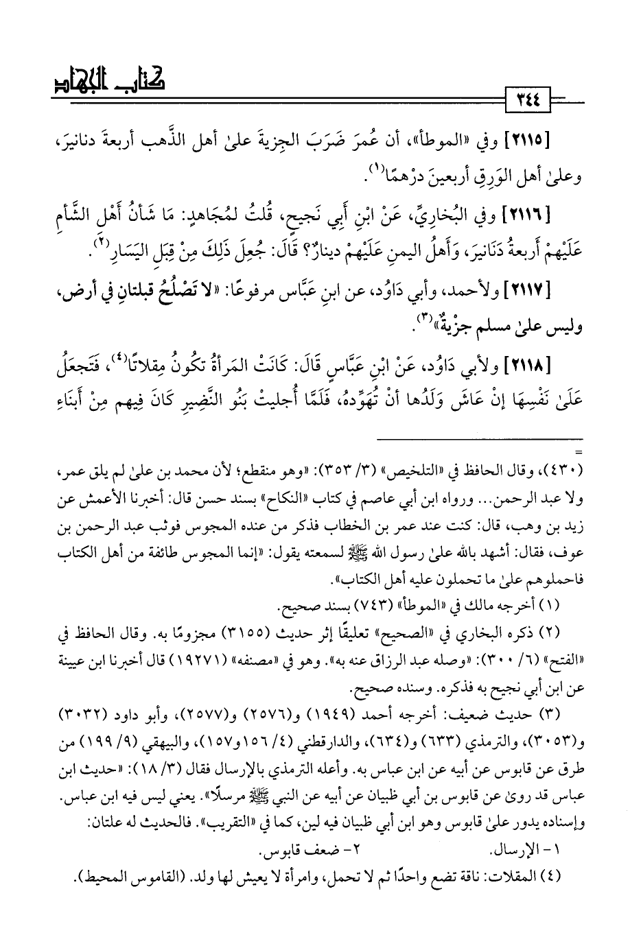[2117] ولأحمد، وأبي دَاوُد، عن ابنِ عَبَّاس مرفوعًا: "لا تَصْلُحُ قبلتانِ في أرض، وليس على مسلم جزْيةٌ" (¬3).