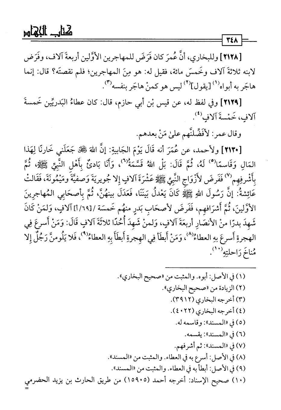 [2130] ولأحمد، عن عُمَرَ أنه قَالَ يَوْمَ الجَابيةِ: إنَّ اللَّهَ عَزَّ وَجَلَّ جَعَلَني خَارنًا لِهَذا المَالِ وَقَاسمًا (¬5) لَهُ، ثُمَّ قَالَ: بَلْ اللَّهُ قَسّمَةُ (¬6)، وَأنا بَادئ بِأَهْلِ النَّبِيِّ -صلى اللَّه عليه وسلم-، ثُمَّ بِأَشْرفِهِم (¬7) فَفَرضَ لأَزْوَاجِ النَّبِيِّ -صلى اللَّه عليه وسلم- عَشْرَةَ آلاف إِلا جُويريَةَ وَصفيَّةَ ومَيْمُونَةَ، فَقَالتْ عَائِشةُ: إنَّ رَسُولَ اللَّهِ -صلى اللَّه عليه وسلم- كَانَ يَعْدلُ بَينَنَا، فَعَدَلَ بينهُنَّ، ثُمَّ بِأصحَابِي المُهاجرِينَ الأوَّلينَ، ثُمَّ أَشرَافهِم، فَفَرضَ لأصحَابِ بَدرٍ منهُم خَمسَة آلافِ، وَلمَنْ كَانَ شَهِدَ بدرًا منْ الأَنصَارِ أربعَةَ آلافِ، وَلمنْ شَهِدَ أُحُدَا ثلاثَةَ آلافٍ قَالَ: وَمَنْ أَسرعَ فِي الهجرةِ أَسرعَ بهِ العطاءُ (¬8)، وَمَنْ أَبطَأ فِي الهِجرةِ أَبطَأَ بِهِ العطاءُ (¬9)، فَلَا يَلُومنَّ رَجُل إِلا مُناخ رَاحلتِهِ (¬10).