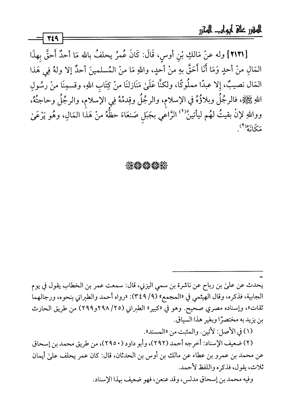 [2131] وله عنْ مَالكِ بْنِ أوسٍ، قَالَ: كَانَ عُمرُ يحلفُ باللَّه مَا أحدٌ أَحقَّ بِهذَا المَالِ منْ أحدٍ وَمَا أَنَا أَحَقَ بهِ منْ أحدٍ، واللَّهِ مَا منْ المُسلمينَ أحدٌ إلا ولهُ فِي هذا المَال نصيبٌ، إِلا عبدًا مملُوكًا، ولكنَّا عَلَى مَنَازلنَا منْ كِتَابِ اللَّهِ، وقسمِنَا منْ رسُولِ اللَّهِ -صلى اللَّه عليه وسلم-، فالرجُلُ وبلاؤُهُ في الإِسلامِ، والرجُلُ وقِدمُهُ فِي الإسلامِ، والرجُلُ وحاجتُهُ، وواللَّهِ لإنْ بقيتُ لهُم ليأتينَّ (¬1) الرَّاعي بجَبَلِ صَنعَاءَ حظُّهُ منْ هَذا المَالِ، وهُو يَرْعَى مَكَانَهُ (¬2).