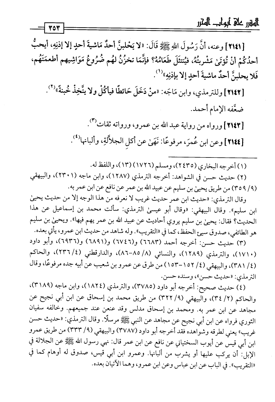 [2144] وعن ابن عُمرَ، مرفوعًا: نَهَى عن أكلِ الجلَّالةِ، وألبانها (¬4).