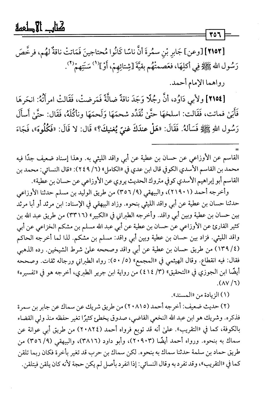 [2154] ولأبي دَاوُد، أنَّ رجُلًا وَجَدَ ناقةً ضالةً فَمَرضتْ، فَقَالتْ امرأتهُ: انحَرهَا فَأَبَى فماتت، فَقَالت: اسلخهَا حتَّى نُقَدِّد شحمَهَا وَلَحمَهَا ونأكُلَهُ، فَقَال: حتَّى أَسأَل رَسُول اللَّهِ -صلى اللَّه عليه وسلم- فَسَألهُ. فَقَالَ: "هَلْ عندَكَ غنًى يُغنيكَ؟ " قَال: لا قَالَ: "فَكُلُوهَ"، فَجَاءَ