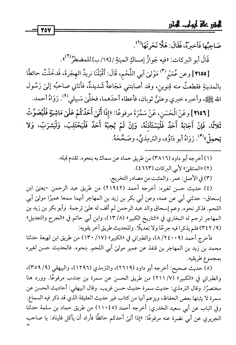 [2156] وعَنْ الْحَسَنِ، عَنْ سَمُرَةَ مرفوعًا: "إِذَا أتي أَحَدُكمْ عَلَى مَاشِيَةٍ فَلْيُصَوِّتْ ثَلاثًا، فَإنْ أَجَابَهُ أَحَدٌ فَلْيَسْتَأذِنْهُ، وَإنْ لَمْ يُجبْهُ أَحَدٌ فَلْيحْتَلِبْ، وَلْيَشرَبْ، وَلَا يَحمِلْ" (¬5). رَوَاهُ أبو دَاوُد، والترمِذيِّ، وصَحَّحَهُ.