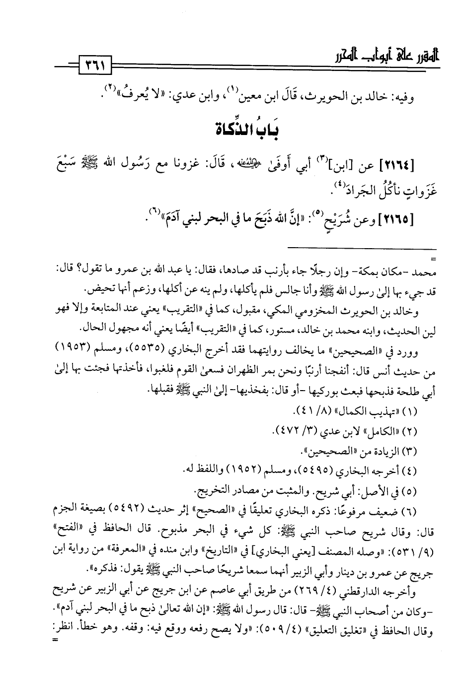 (¬6) ضعيف مرفوعًا: ذكره البخاري تعليقًا في "الصحيح" إثر حديث (5492) بصيغة الجزم قال: وقال شريح صاحب النبي -صلى اللَّه عليه وسلم-: كل شيء في البحر مذبوح. قال الحافظ في "الفتح" (9/ 531): "وصله المصنف [يعني البخاري] في "التاريخ" وابن منده في "المعرفة" من رواية ابن جريج عن عمرو بن دينار وأبي الزبير أنهما سمعا شريحًا صاحب النبي -صلى اللَّه عليه وسلم- يقول: فذكره".