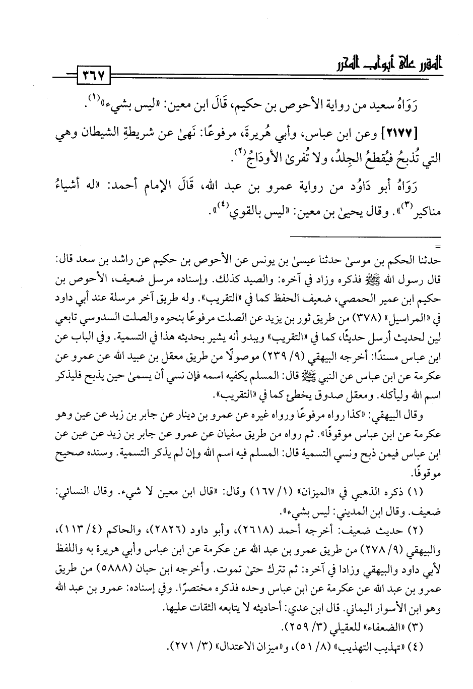 [2177] وعن ابن عباس، وأبي هُريرةَ، مرفوعًا: نَهى عن شريطةِ الشيطان وهي التي تُذبحُ فيُقطعُ الجِلدُ، ولا تُفرى الأودَاجُ (¬2).