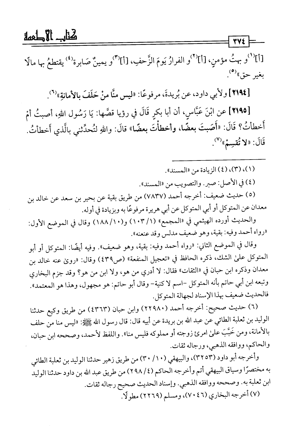 (¬6) حديث صحيح: أخرجه أحمد (22980) وابن حبان (4363) من طريق وكيع حدثنا الوليد بن ثعلبة الطائي عن عبد اللَّه بن بريدة عن أبيه قال: قال رسول اللَّه -صلى اللَّه عليه وسلم-: "ليس منا من حلف بالأمانة، ومن خَبَّبَ على امرئ زوجته أو مملوكه فليس منا". واللفظ لأحمد، وصححه ابن حبان، والحاكم، ووافقه الذهبي، ورجاله ثقات.