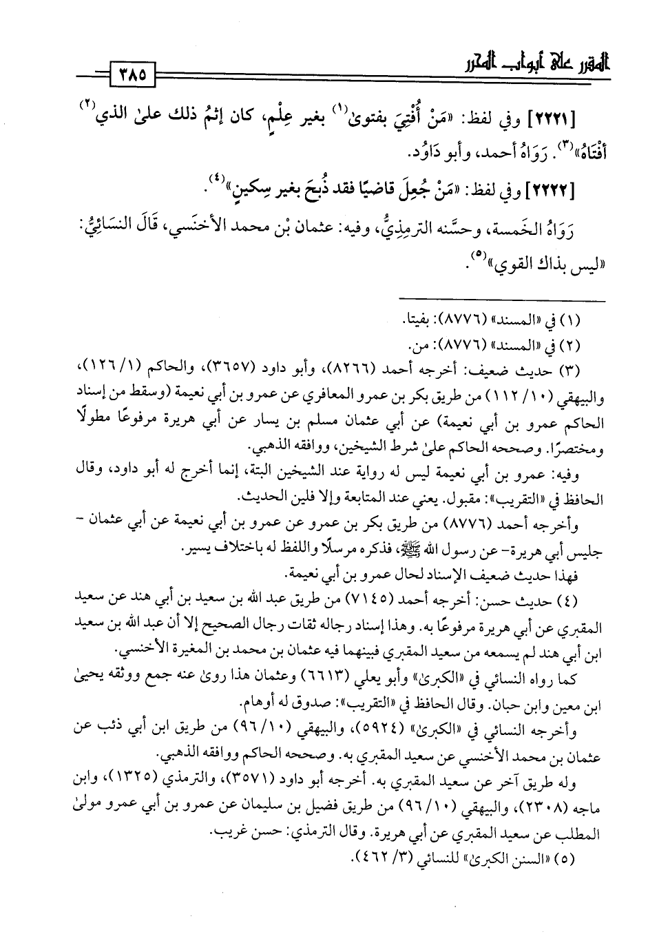[2221] وفي لفظْ: "مَنْ أُفْتِيَ بفتوى (¬1) بغير عِلْمٍ، كان إثمُ ذلك على الذي (¬2) أفْتَاهُ" (¬3). رَوَاهُ أحمد، وأبو دَاوُد.