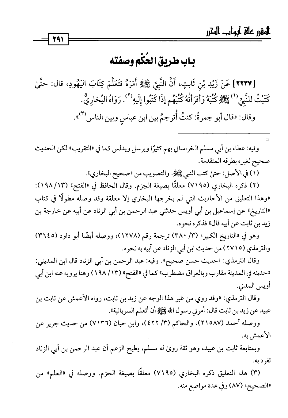 [2237] عَنْ زَيْدِ بْنِ ثَابتٍ، أَنَّ النَّبِيَّ -صلى اللَّه عليه وسلم- أَمَرَهُ فتَعَلَّمَ كِتَابَ اليَهُودِ، قال: حتَّى كَتَبْتُ للنَّبِيِّ (¬1) -صلى اللَّه عليه وسلم- كُتُبَهُ وَأقرَأتُهُ كُتُبَهُم إذَا كَتَبُوا إِلَيهِ (¬2). رَوَاهُ البُخارِيُّ.
