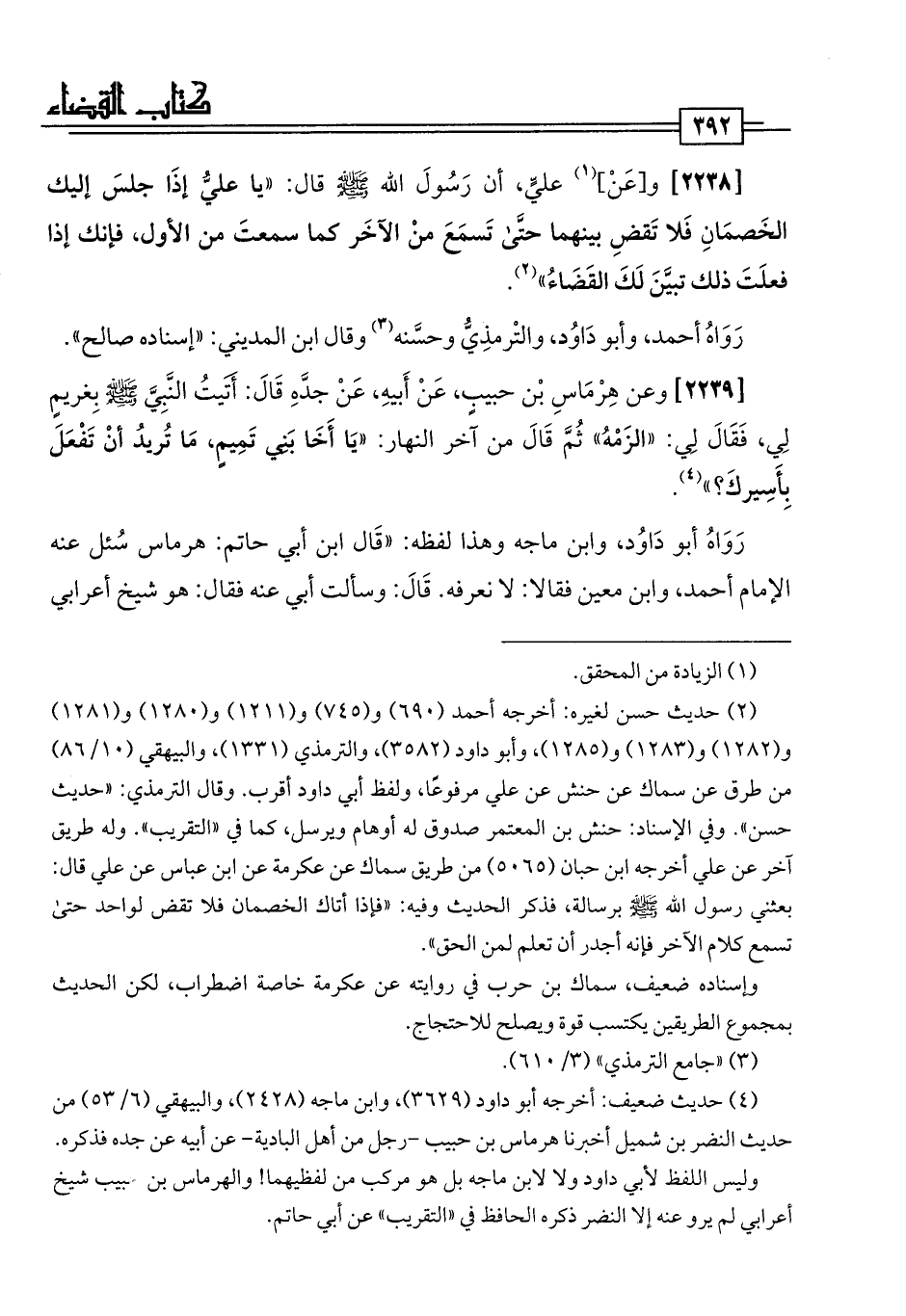 [2228] و [عَنْ] (¬1) عليٍّ، أن رَسُولَ اللَّه -صلى اللَّه عليه وسلم- قال: "يا عليُّ إذَا جلسَ إليك الخَصمَانِ فَلَا تَقضِ بينهما حتَّى تَسمَعَ منْ الآخَر كما سمعتَ من الأول، فإنك إذا فعلَتَ ذلك تبيَّنَ لَكَ القَضَاءُ" (¬2).