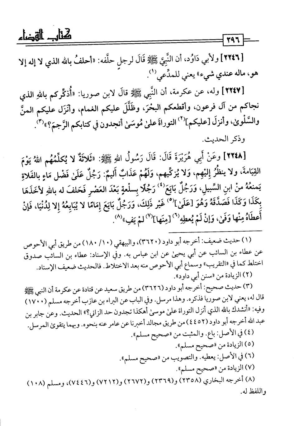 [2248] وعَنْ أَبِي هُرَيْرَةَ قَالَ: قَالَ رَسُولُ اللَّهِ -صلى اللَّه عليه وسلم-: "ثَلاثَةٌ لا يُكلِّمُهُم اللَّهُ يَوْمَ القِيَامةَ، ولا ينظُرُ إِليْهِم، وَلَا يُزكِّيهم، وَلَهُمْ عَذَابٌ أَليمٌ: رَجُلٌ عَلَى فَضْل مَاءٍ بالفَلاةِ يَمنعُهُ منْ ابنِ السِّبيلِ، وَرَجُلٌ بَايَعَ (¬4) رَجُلًا بِسلْعةٍ بَعْدَ العَصْرِ فَحَلفَ له باللَّهِ لأخَذَهَا بكَذَا وَكَذَا فَصَدَّقَهُ وَهُوَ [عَلَى] (¬5) غَيْر ذَلِكَ، وَرَجُلٌ بَايَعَ إِمَامًا لا يُبَايِعُهُ إِلا لِدُنْيَا، فَإنْ أَعطَاهُ مِنْها وَفَى، وَإنْ لَمْ يُعطِهِ (¬6) [مِنَها] (¬7) لمْ يَفِ" (¬8).