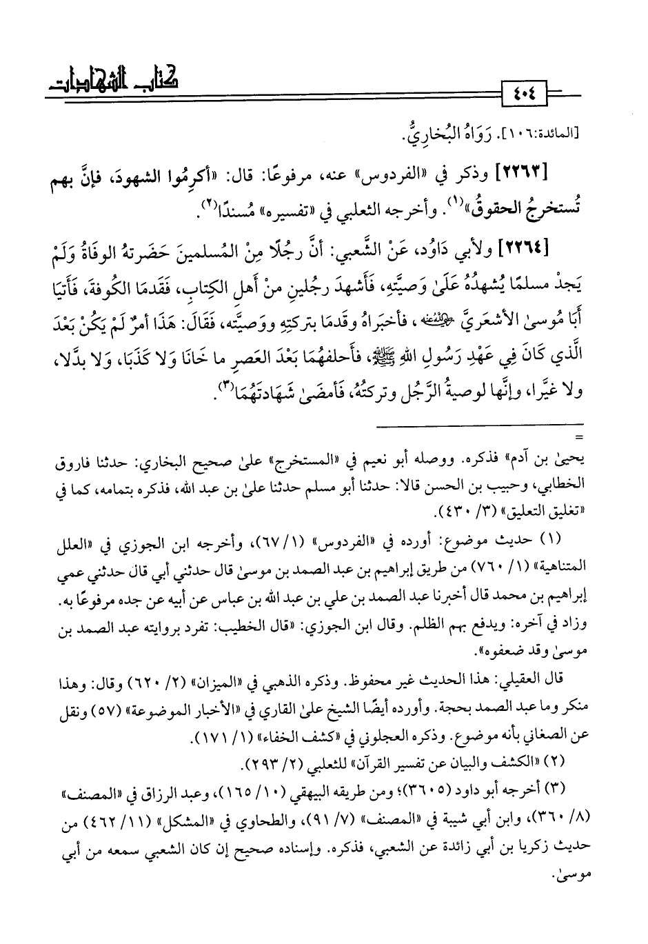 [2264] ولأبي دَاوُد، عَنْ الشَّعبي: أنَّ رجُلًا مِنْ المُسلمينَ حَضَرتهُ الوفَاةُ وَلَمْ يَجدْ مسلمًا يُشهدُهُ عَلَى وَصيَّتهِ، فَأَشهدَ رجُلينِ منْ أَهلِ الكِتابِ، فَقَدمَا الكُوفةَ، فَأَتيَا أَبَا مُوسي الأشعَريَّ -رضي اللَّه عنه-، فأخبَراهُ وقَدمَا بتركتِهِ ووَصيَّته، فَقَالَ: هَذَا أمر لَمْ يَكُنْ بَعْدَ الَّذي كَانَ فِي عَهْدِ رَسُولِ اللَّهِ -صلى اللَّه عليه وسلم-، فأَحلفهُمَا بَعْدَ العَصرِ ما خَانَا وَلَا كَذَبَا، وَلَا بدَّلا، ولا غيَّرا، وإنَّها لوصيةُ الرَّجُل وتركتُهُ، فَأمضَى شَهَادتَهُمَا (¬3).