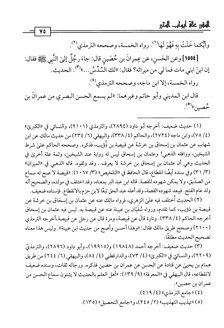 [1554] وعن الحَسنِ، عن عِمرانَ بن حُصينٍ قال: جاءَ رجُلٌ إلى النَّبِي -صلى اللَّه عليه وسلم- فقال: إن ابنَ ابني مات فما لي من ميراثه؟ فقال: "لك السُدُسُ. . . " (¬3). الحديث.