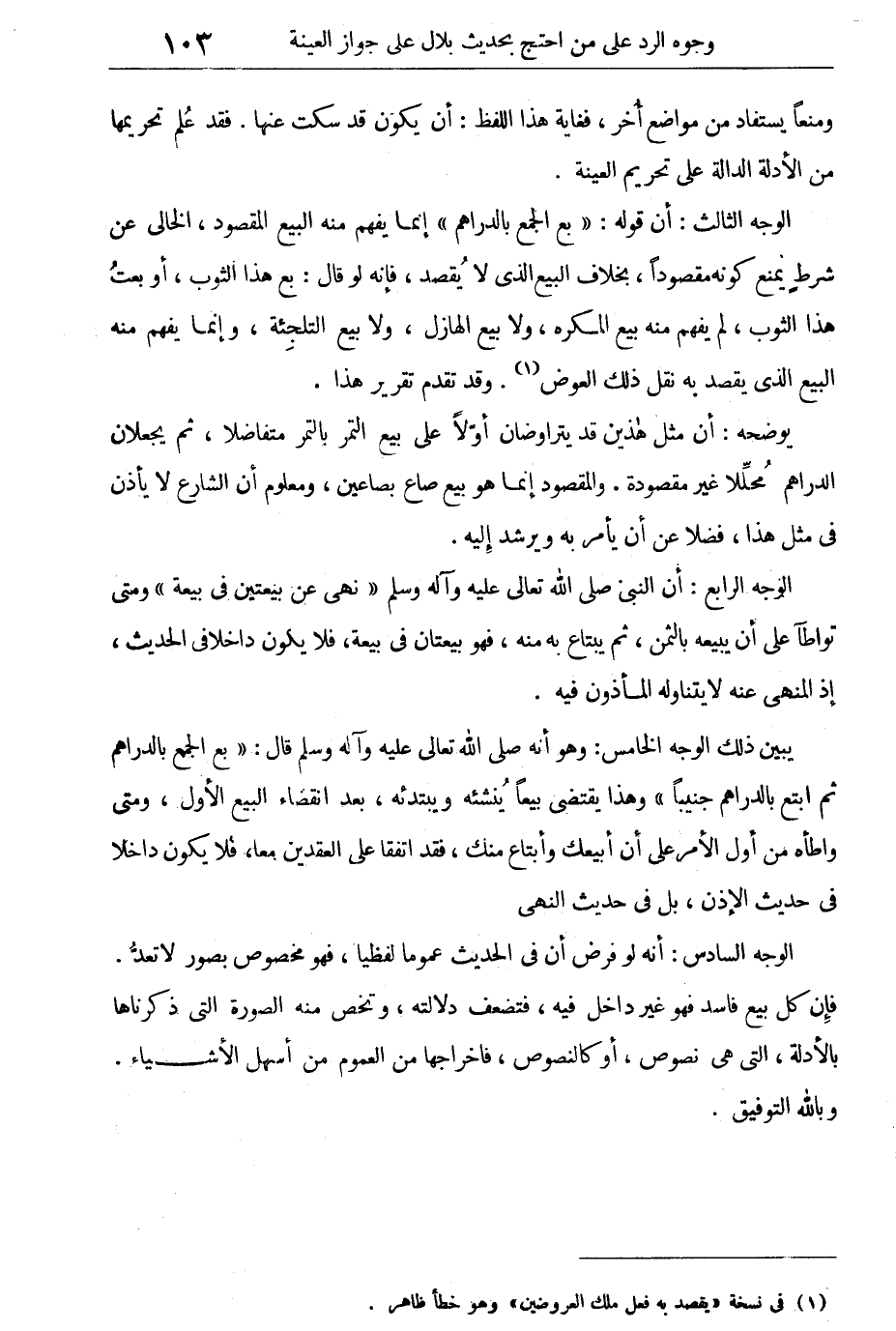 الوجه السادس: أنه لو فرض أن فى الحديث عموماً لفظيا، فهو مخصوص بصور لا تعد. فإن كل بيع فاسد فهو غير داخل فيه، فتضعف دلالته، وتخص منه الصورة التى ذكرناها بالأدلة، التى هى نصوص، أو كالنصوص، فإخراجها من العموم من أسهل الأشياء، وبالله التوفيق.
