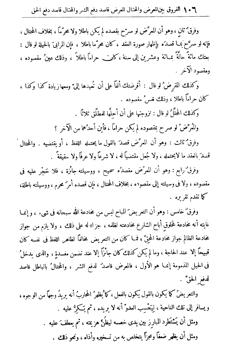 وفرق ثالث: وهو أن المعرض قصد بالقول ما يحتمله اللفظ، أو يقتضيه. والمحتال قصد بالعقد مالا يحتمله، ولا جعل مقتضياً له، شرعاً ولا عرفاً ولا حقيقة.